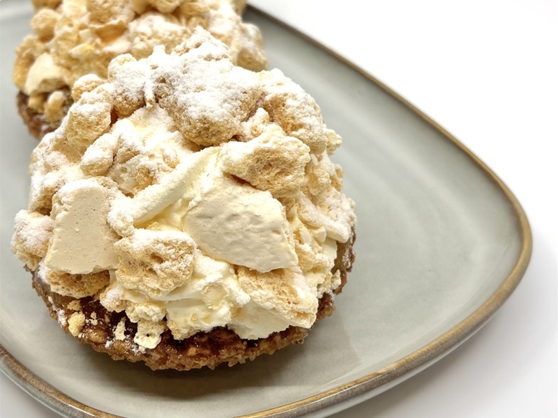 Een schelpje gevuld met kersen, slagroom en meringue schuim.