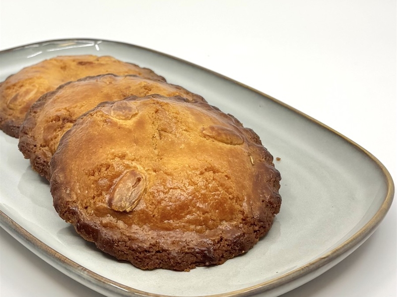 Een gevulde koek zoals hij hoort te zijn. Knapperig randje en gevuld met échte amandelspijs.