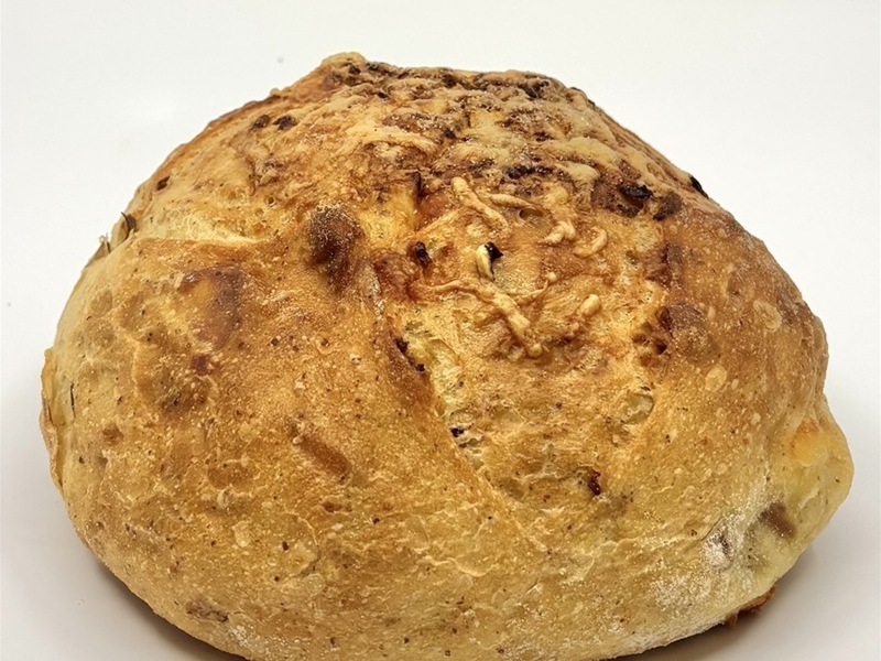 Dit desembrood is gebakken in onze steenoven en heeft daardoor een heerlijke krokante korst. Een witte desem gemaakt van tarwebloem en gevuld met mosterd, oude kaas en een gebakken uitje. Gemaakt met onze eigen zuurdesem starter.